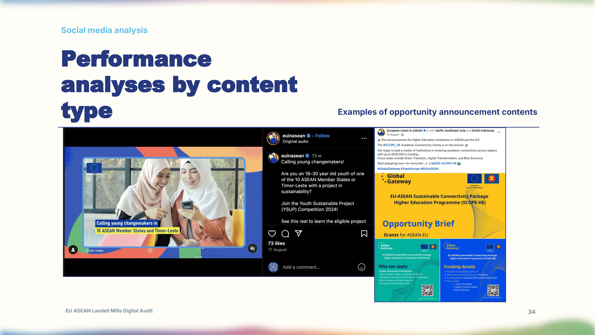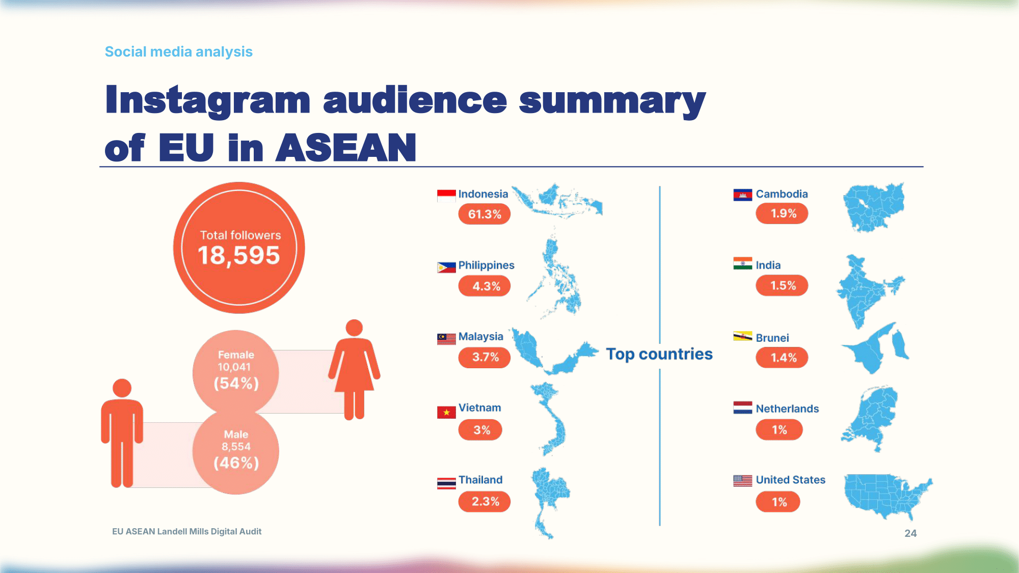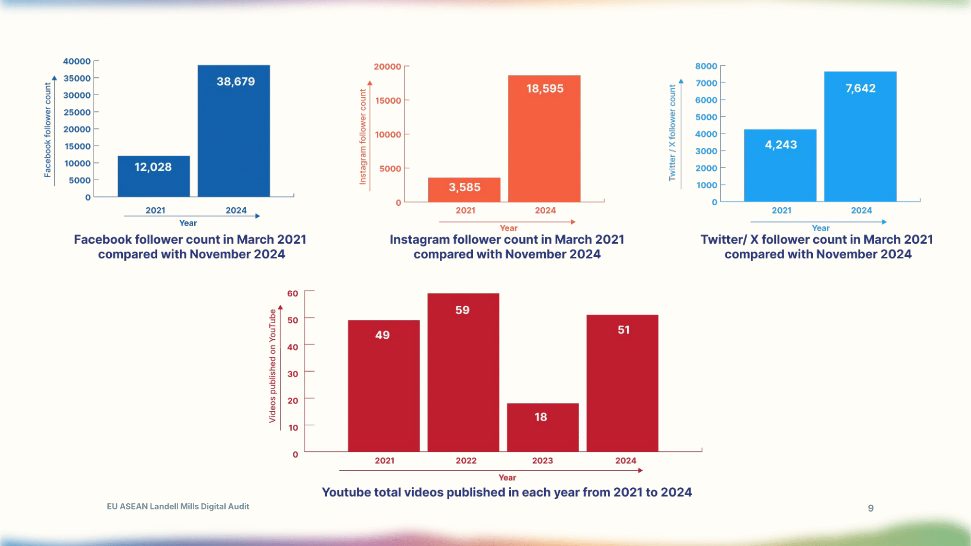 Analysing the euinasean.eu microsite, Big Blue reviewed traffic sources, user locations, behaviour, use of language, and SEO performance. We further assessed the organization’s popularity across various social media platforms, particularly Facebook, Instagram, X, and YouTube, in comparison to other member states in terms of follower growth, content trends, and engagement.